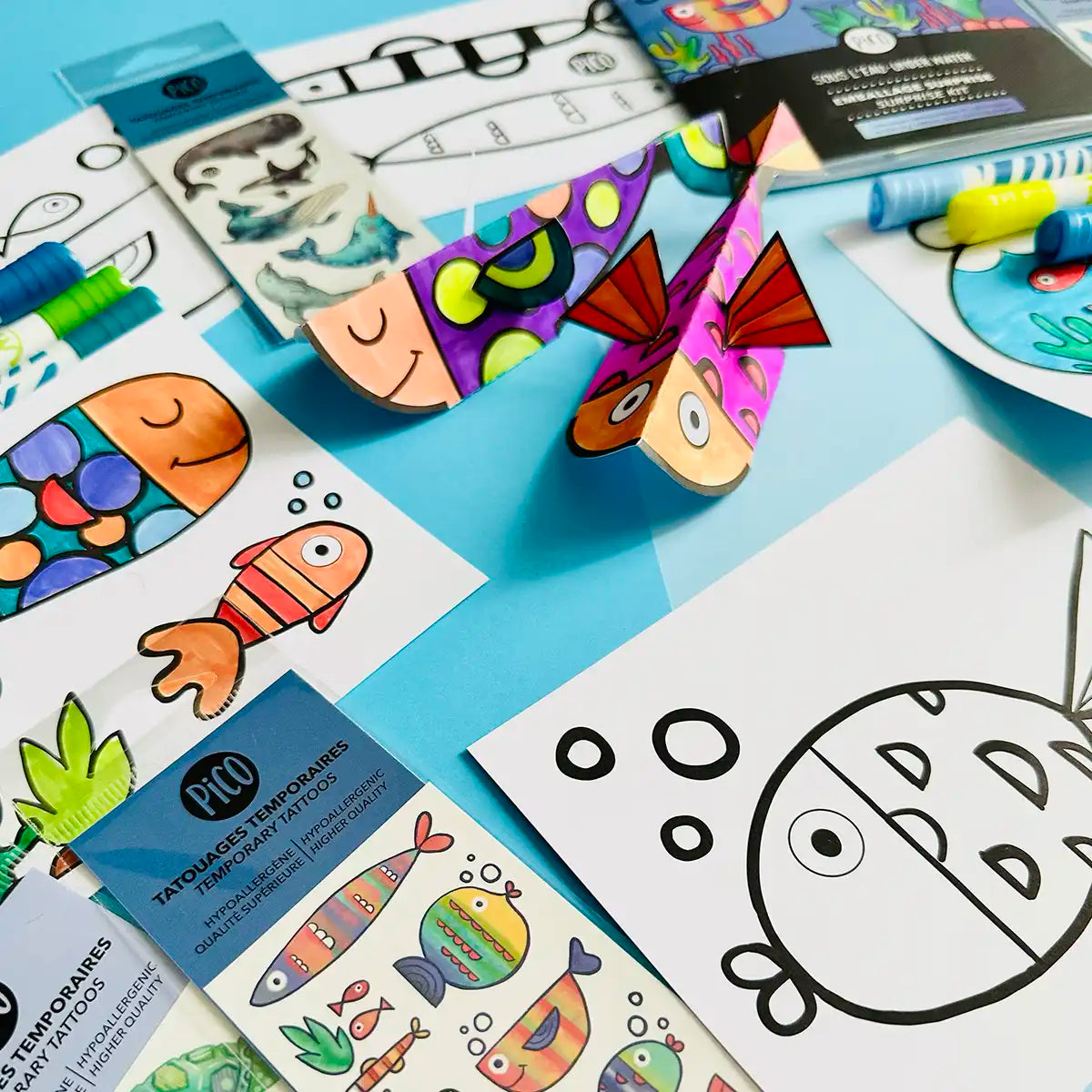The "Underwater" surprise set is perfect for lovers of fish and the seabed. You can use it to celebrate April Fool's Day or to do crafts with the family. In addition to tattoos and coloring, it contains an aquarium to decorate as well as 2 cute little fish to tinker with in 3D. You can add bulk fish packaging to give to your friends.