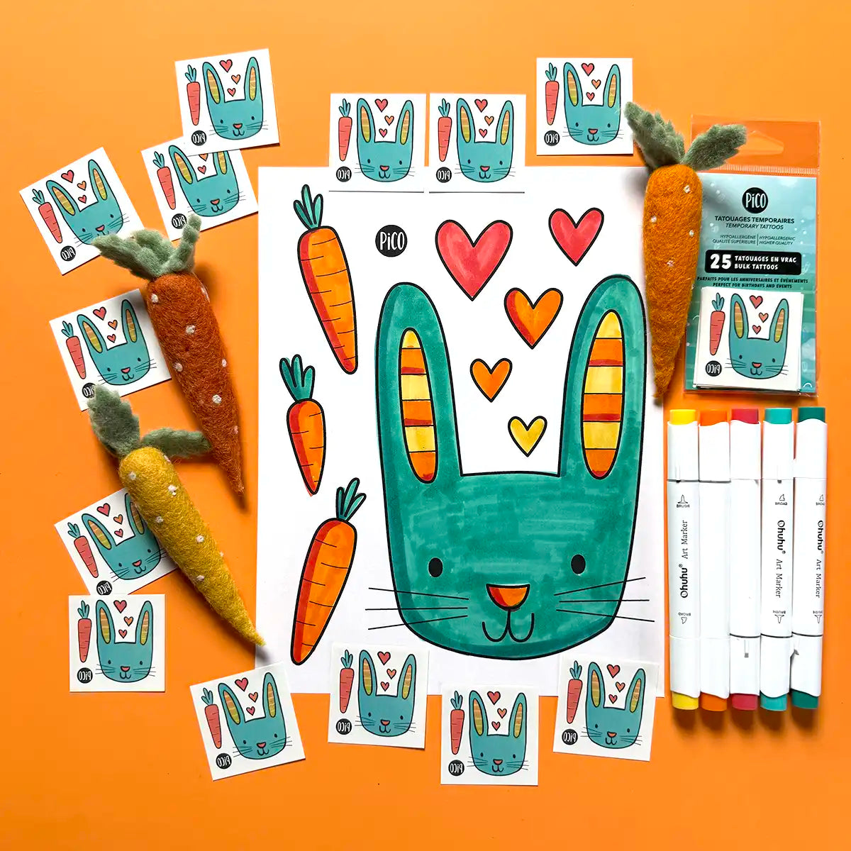 Bring spring into your home with this free coloring page of an adorable Easter bunny with carrots! Children of all ages can let their imaginations run wild coloring this friendly Easter companion. Perfect for livening up Easter activities in the classroom or at home. Simple and fun, this coloring page invites little ones to explore colors. And to extend the festivities even longer, discover our bulk temporary tattoos featuring the Easter bunny theme, for skin decorations that are as cute as they are fleeting!
